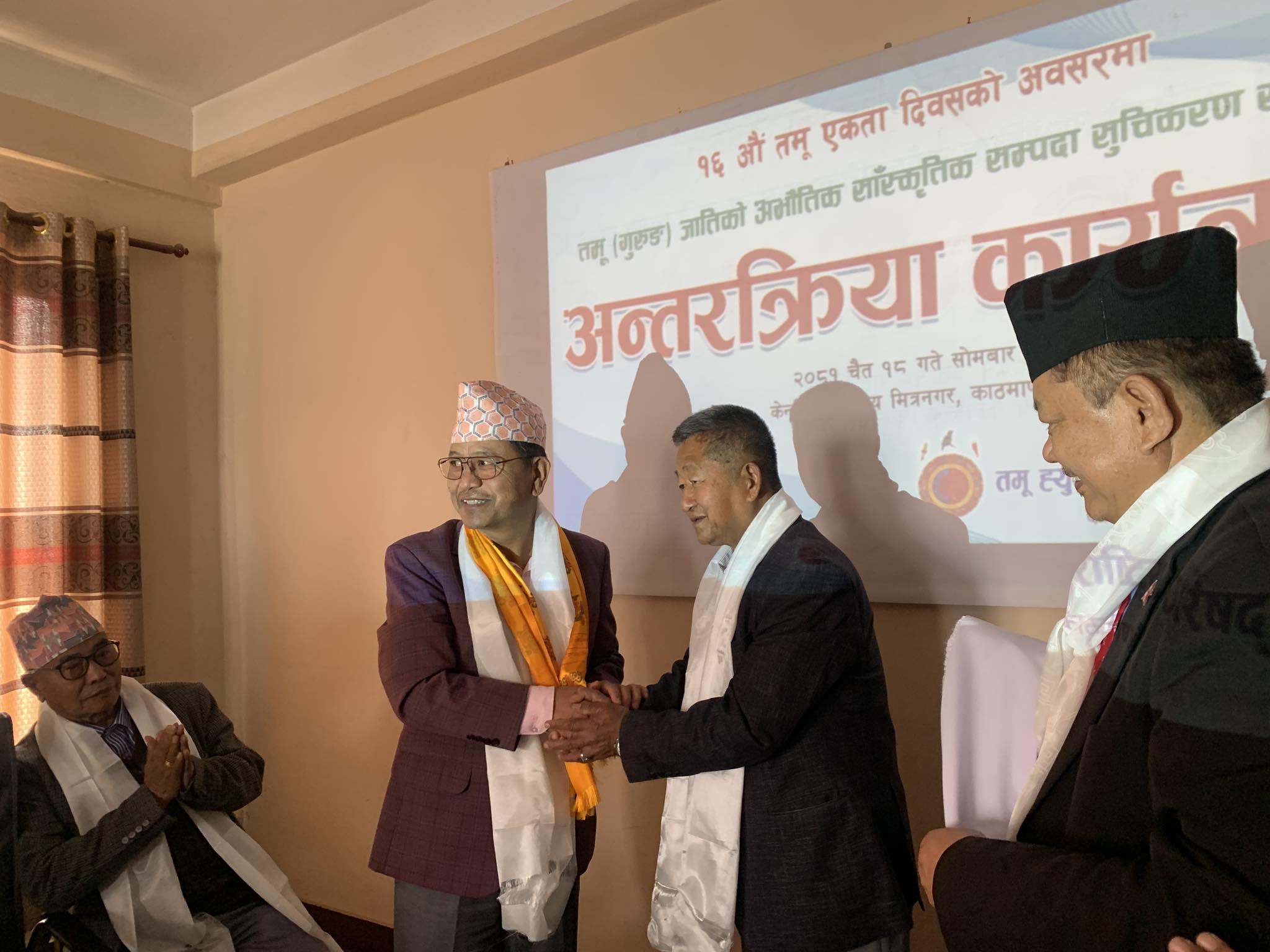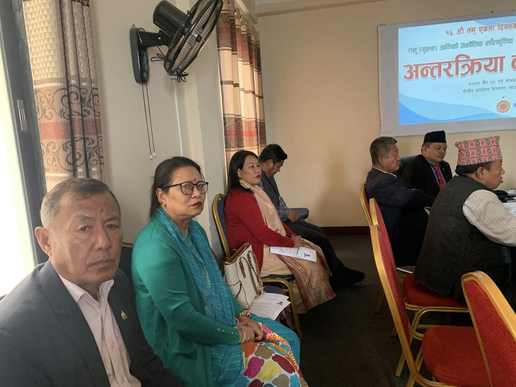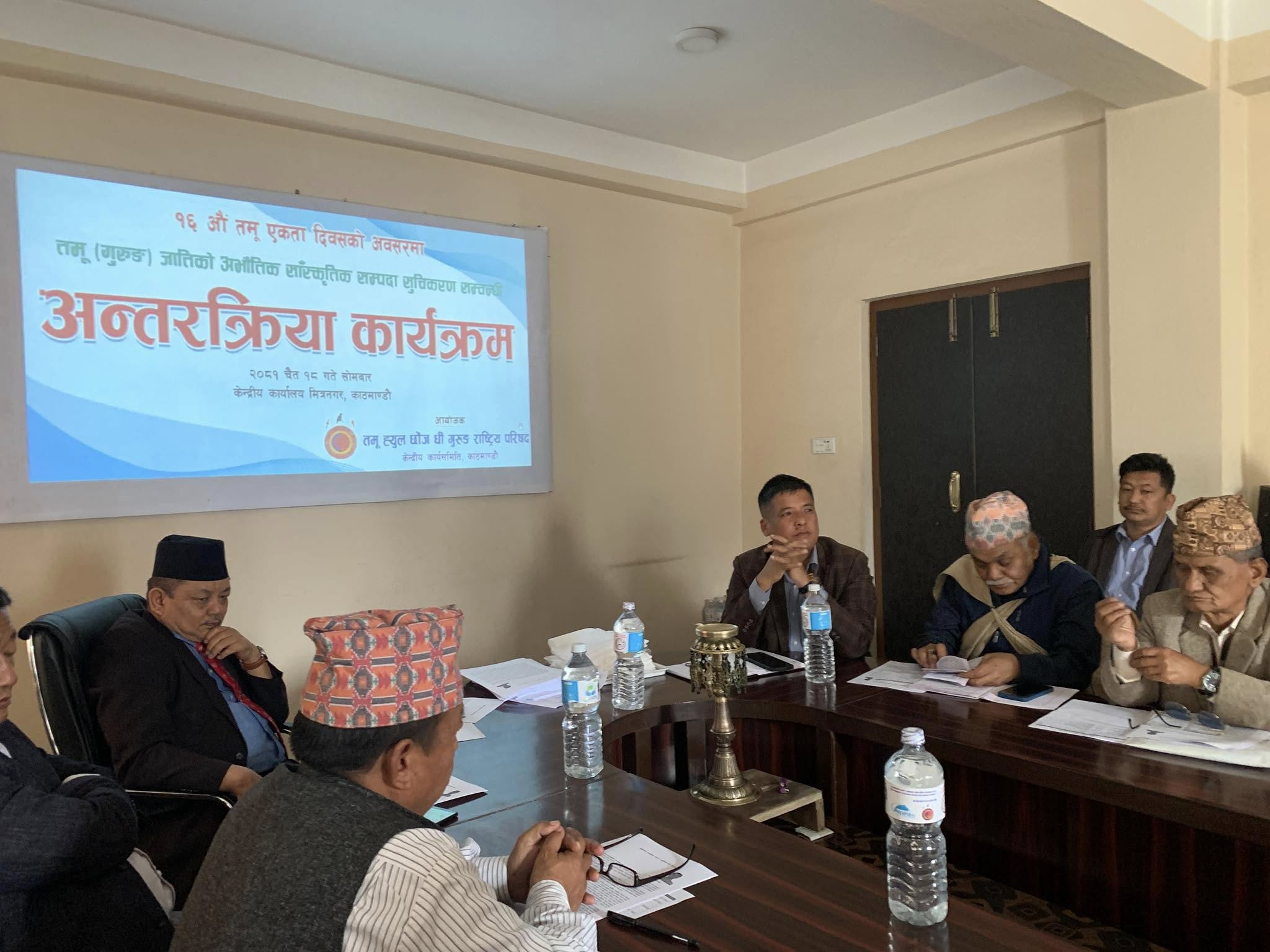 १६ औं तमू एकता दिवसको अवसरमा तमू ह्युल छोंज धीं गुरुङ राष्ट्रिय परिषदको आयोजनामा तमू बिज्ञहरूको उपस्थितिमा तमू जातिको अभौतिक सम्पदाहरूको सुचिकरण सम्वन्धी अन्तरक्रिया कार्यक्रम नेपाल सरकार राष्ट्रिय प्राकृतिक स्रोत तथा बित्त आयोगको का. अध्यक्ष स. जुद्धबहादुर गुरुङको प्रमुख आतिथ्यमा सम्पन्न भयो ।